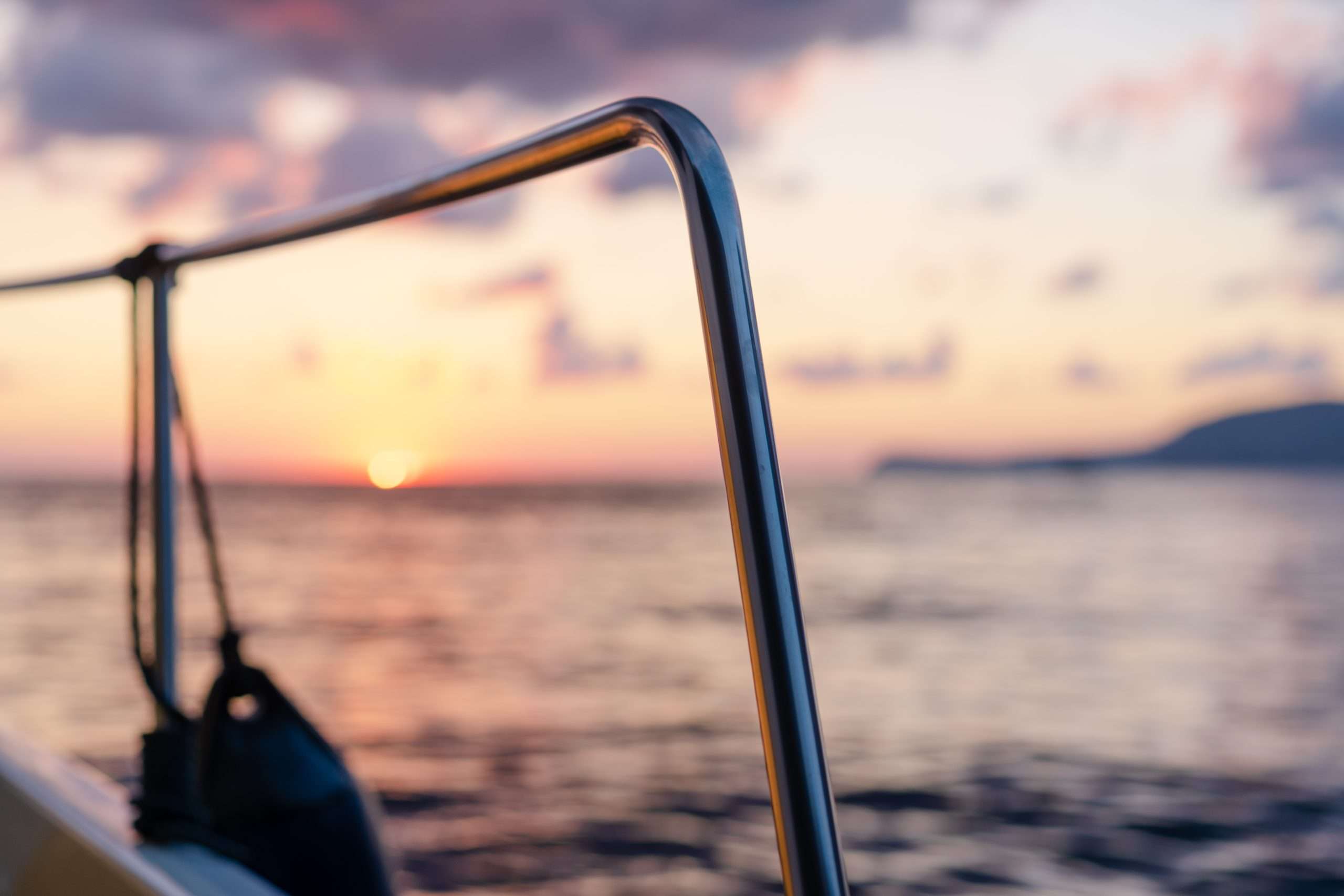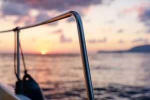 Deck of white yacht sailing in open sea at sunset