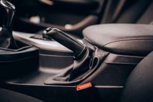 Interior modern car details – close up leather handbreak lever